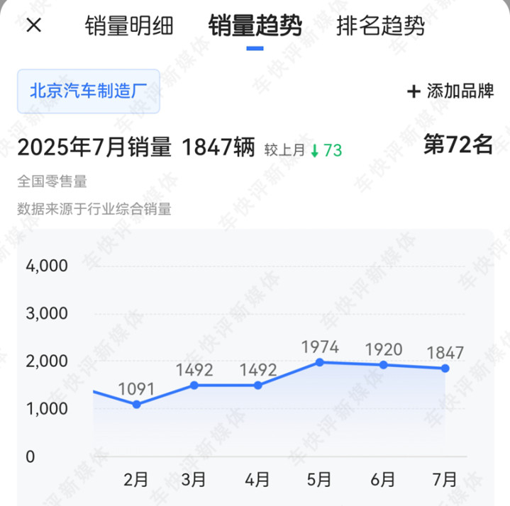另外,目前山东魏桥创业集团在汽车市场的表现也只能说非常一般。去年高调上市的硬派越野车212 T01,最近半年的月销量基本上都维持在1000~1500台之间。在硬派越野车中,市场表现远不如竞品车型。而北京汽车制造厂在售的三款车型王牌M7、勇士和元宝,除了王牌M7能够月销在千辆以上,勇士和元宝月销量基本上都在两位和三位数之间徘徊。